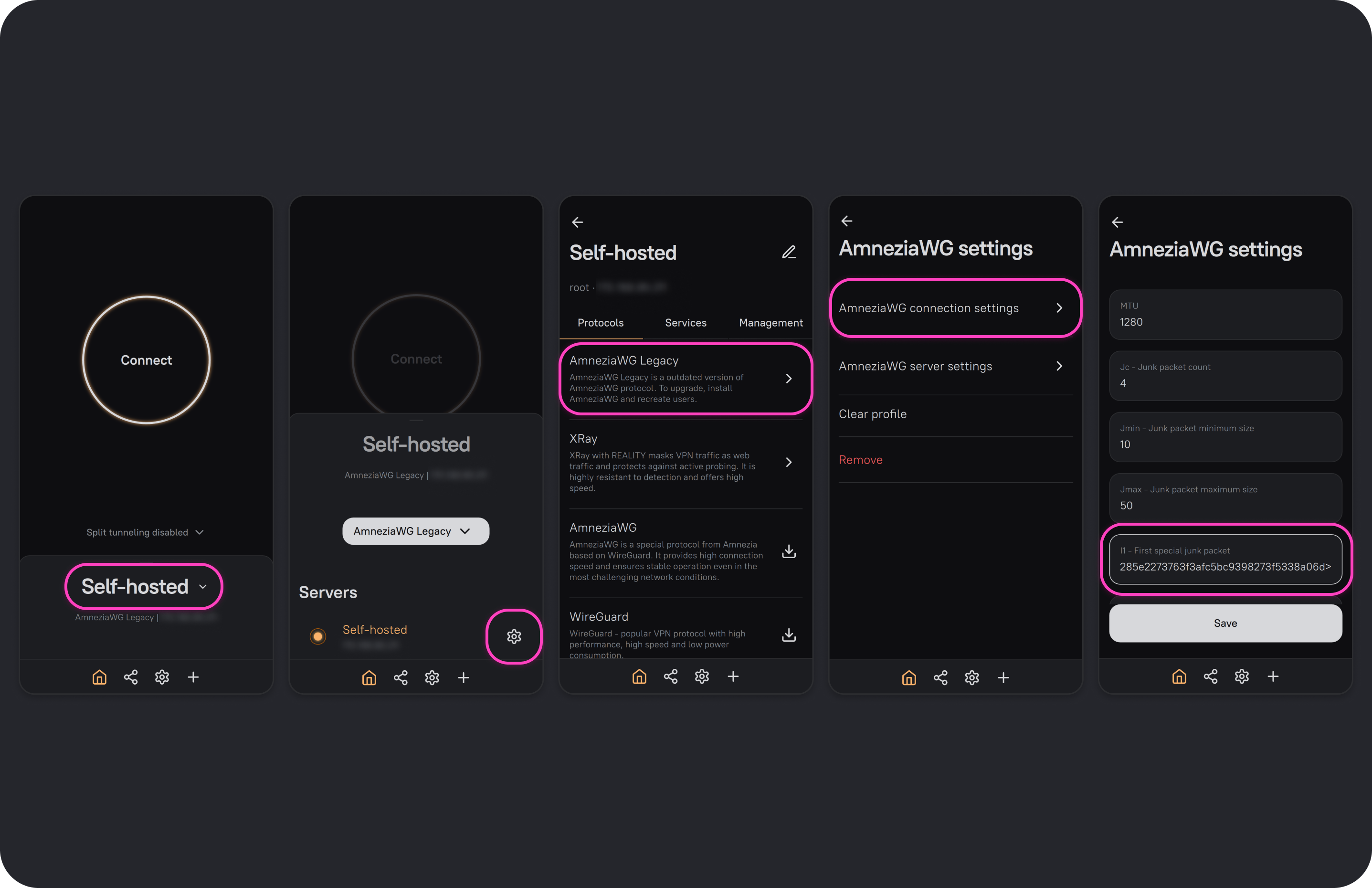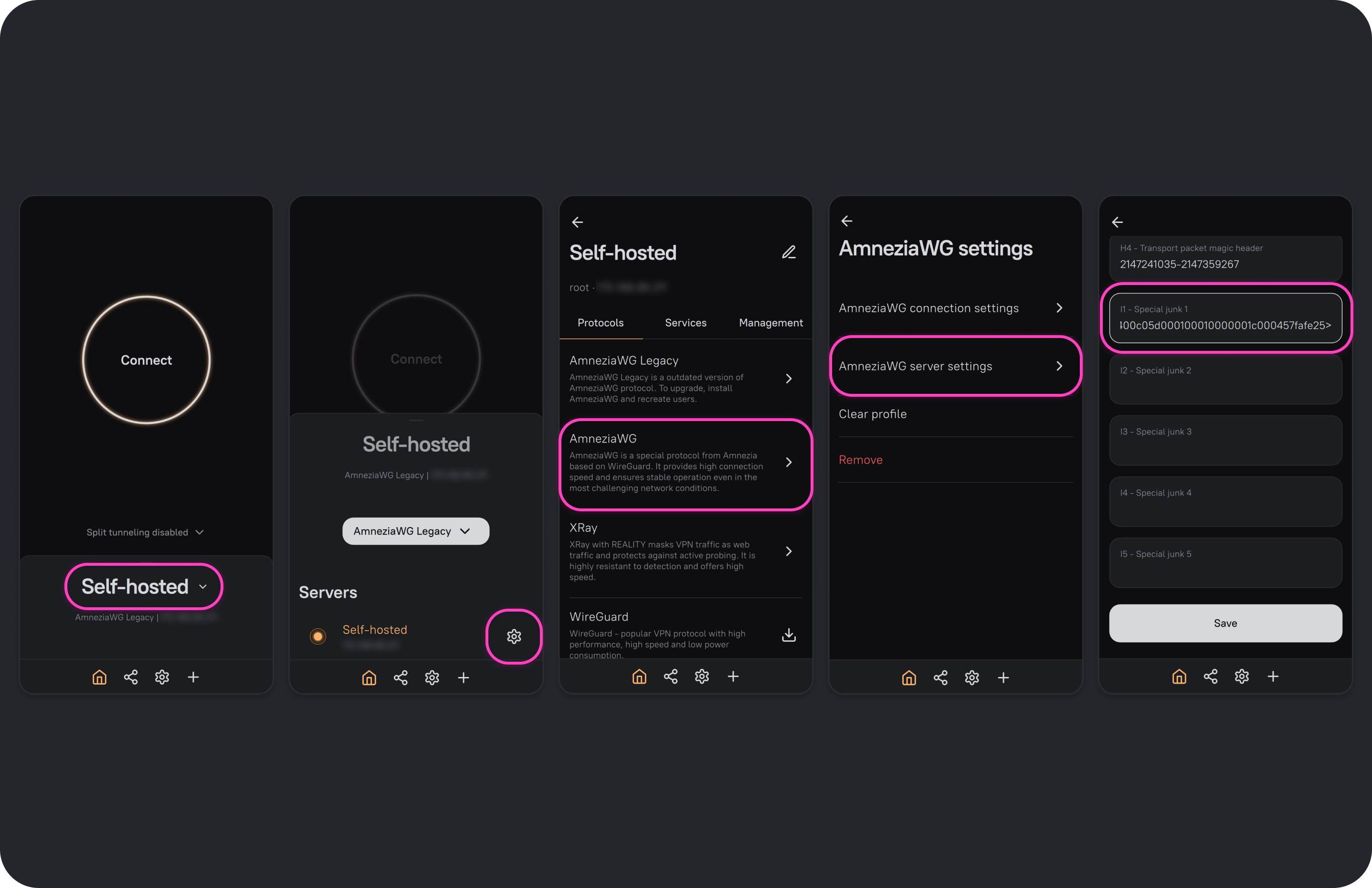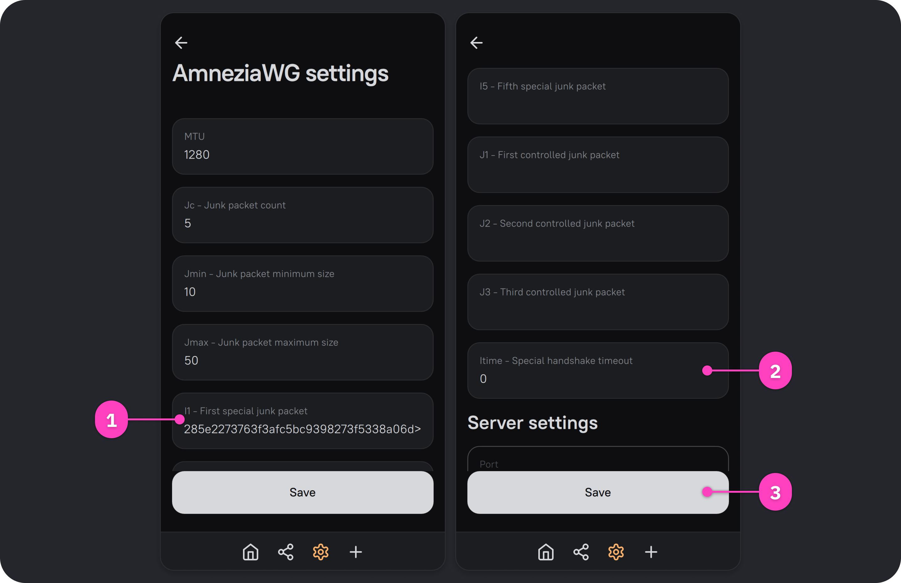 If the server uses the AmneziaWG 2.0 protocol, you can change I1-I5 on the server side so any newly generated VPN configuration file will inherit the server settings. As a result, any device for which a VPN configuration is created will connect to the VPN with the server's protocol settings. If needed, you can also override these settings on the client.