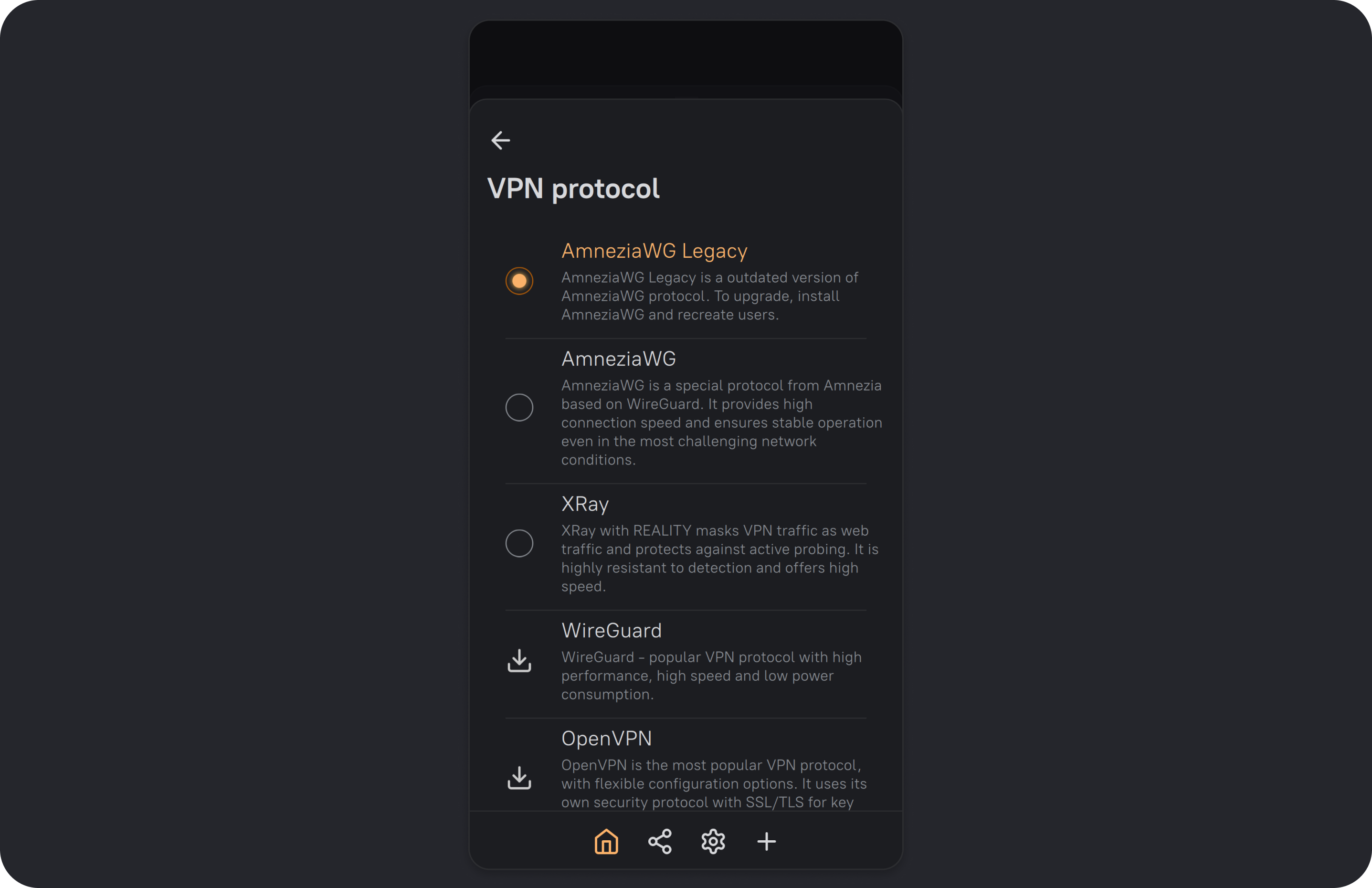 Starting from AmneziaVPN 4.8.12.7, an existing AmneziaWG version 1.0 protocol installation on the server is shown as AmneziaWG Legacy.