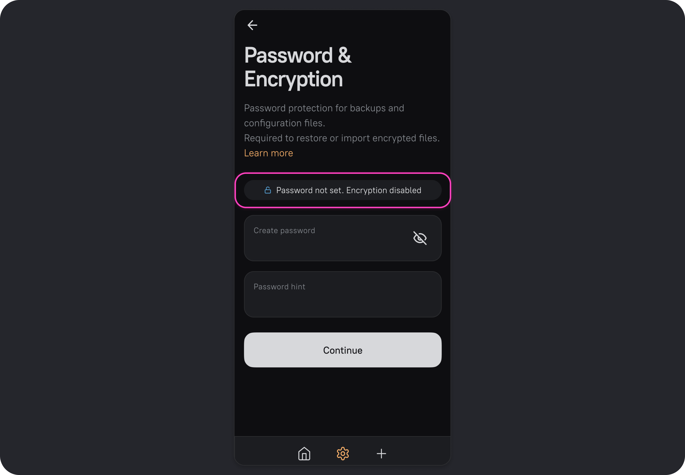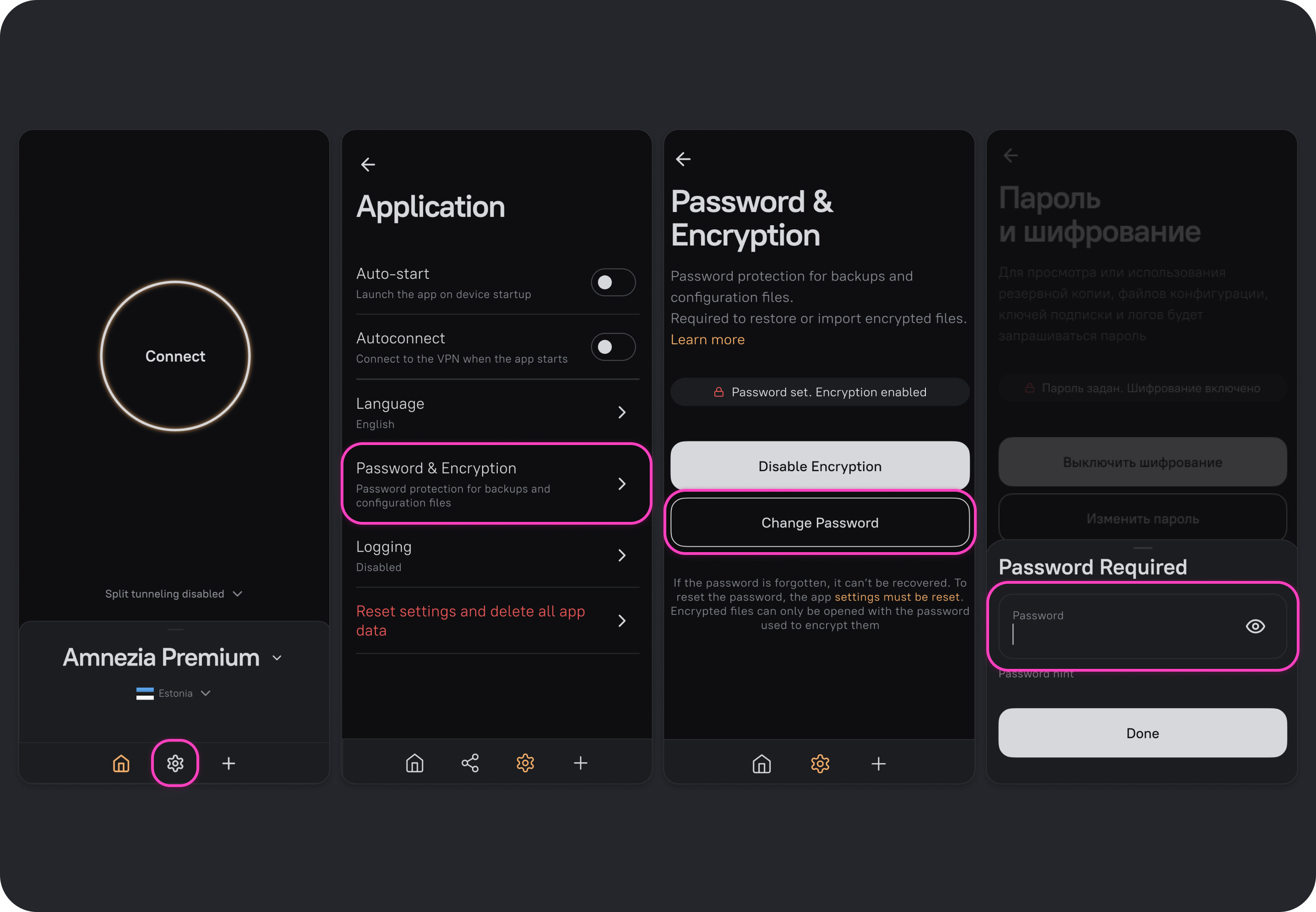 Password & Encryption is a feature in AmneziaVPN that encrypts files created in the app and saved to your device: