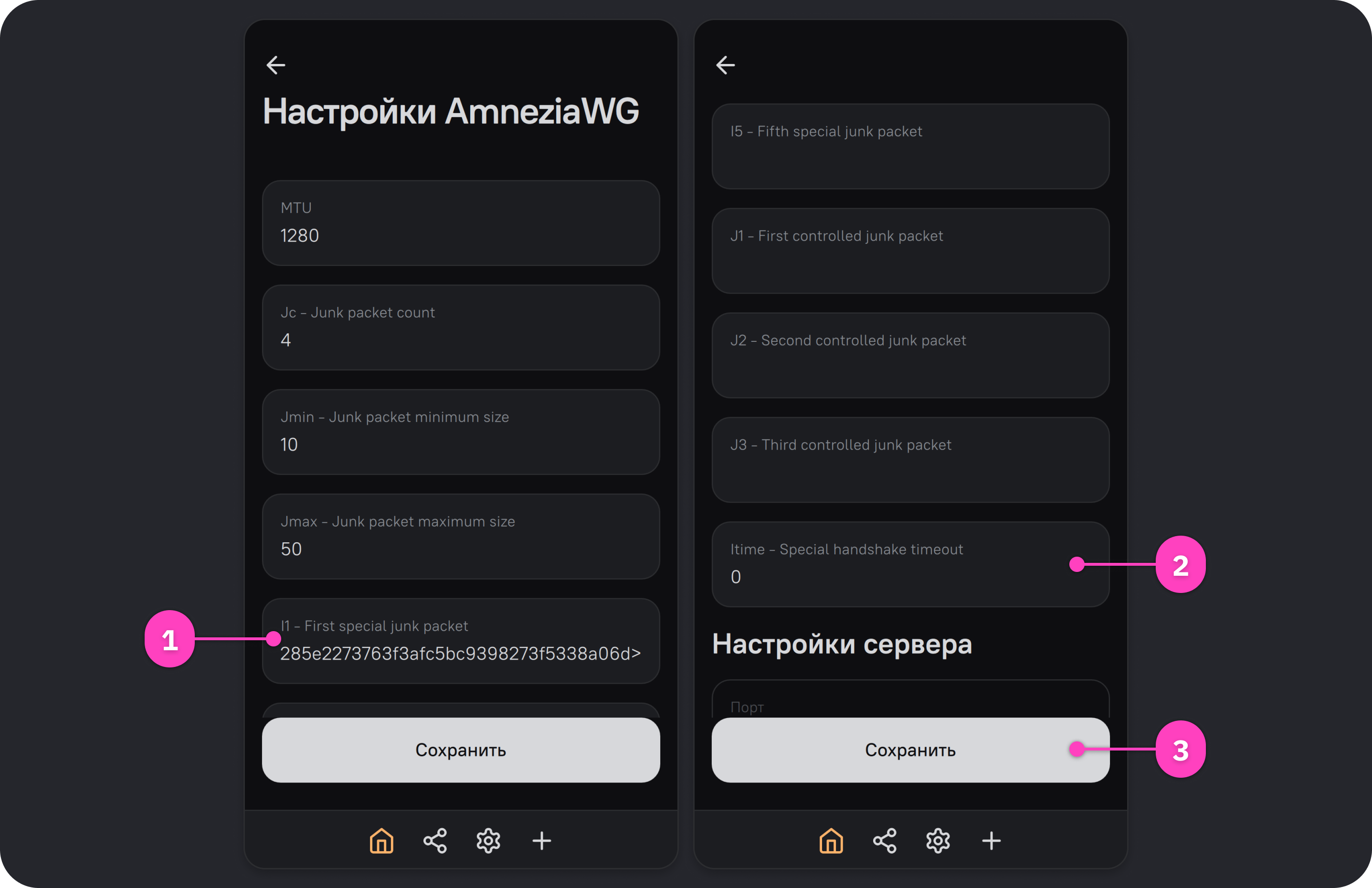 Если на сервере установлен протокол AmneziaWG 2.0, изменить параметры I1–I5 можно сразу на стороне сервера. В результате любое устройство, для которого будет создана VPN-конфигурация, будет подключаться к VPN с серверными настройками протокола. Если по какой-либо причине внести изменения потребуется именно в клиентские настройки подключения, это также можно сделать.