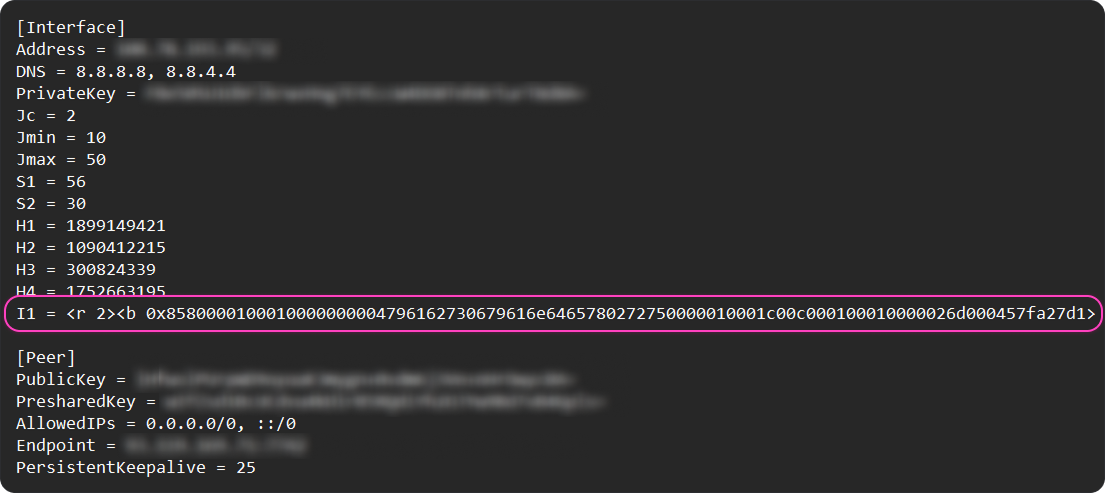 Если у вас есть файл конфигурации .conf для подключения по протоколу AmneziaWG 1.0 и вы хотите повысить устойчивость подключения к блокировкам, можно самостоятельно преобразовать его в формат AmneziaWG 1.5. Для этого достаточно добавить в файл параметр I1 — пакет маскировки трафика.